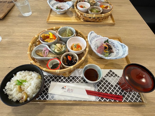 中に入って右手の廊下を進むと、「萩・明倫レストラン・カフェ萩暦」があります。少し早い時間だったせいか待たずに入れました。私たちが注文したのは、萩暦特選ランチセット。7種のおかず、お刺身、栗ご飯、お汁のセットです。どのおかずも美味しく、お刺身も身がぷりぷり、栗ご飯もホクホクでとても美味しかったです。